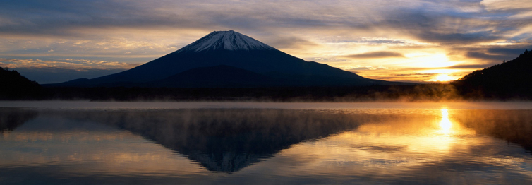 Der Berg Fuji spiegelt sich im Wasser. Ein bewölkter Himmel durch dessen Wolken rechts vom Berg die Sonne strahlt.